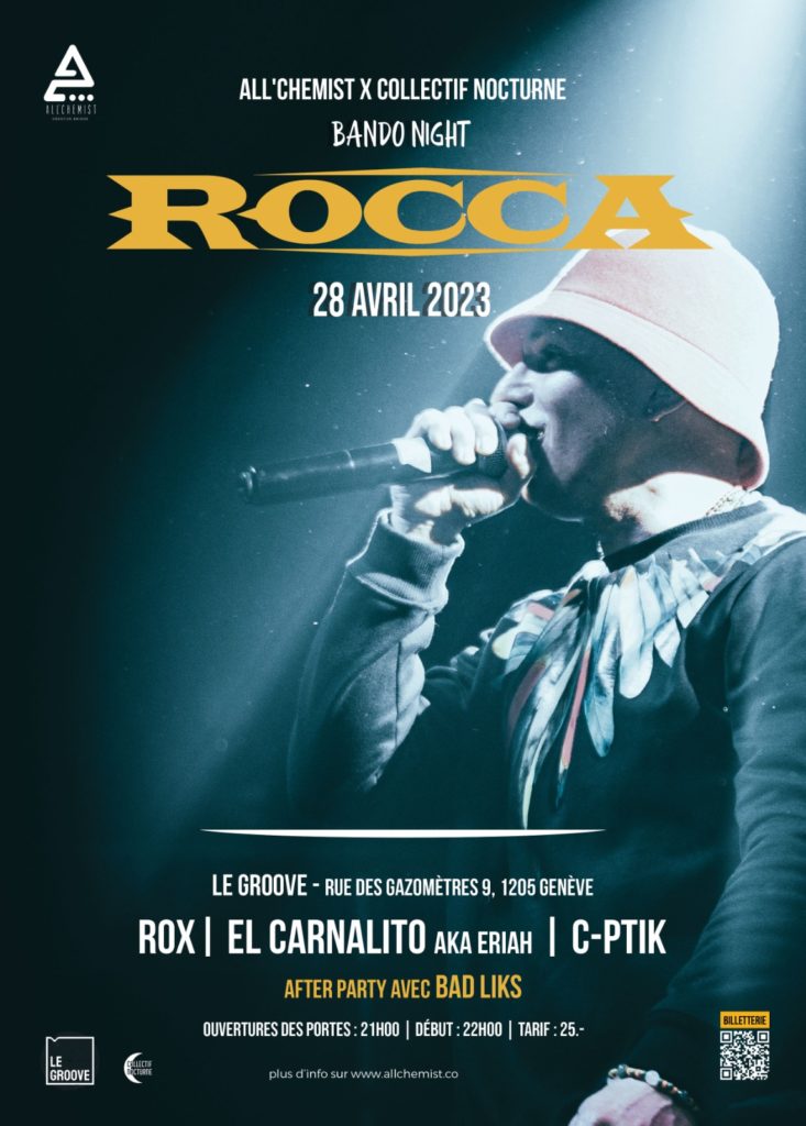 1ère partie : Les rappeurs genevois Rox, El Carnalito aka Eriah et C-Ptik vont mettre le feu sur scène et te chauffer avant le grand show de Rocca.